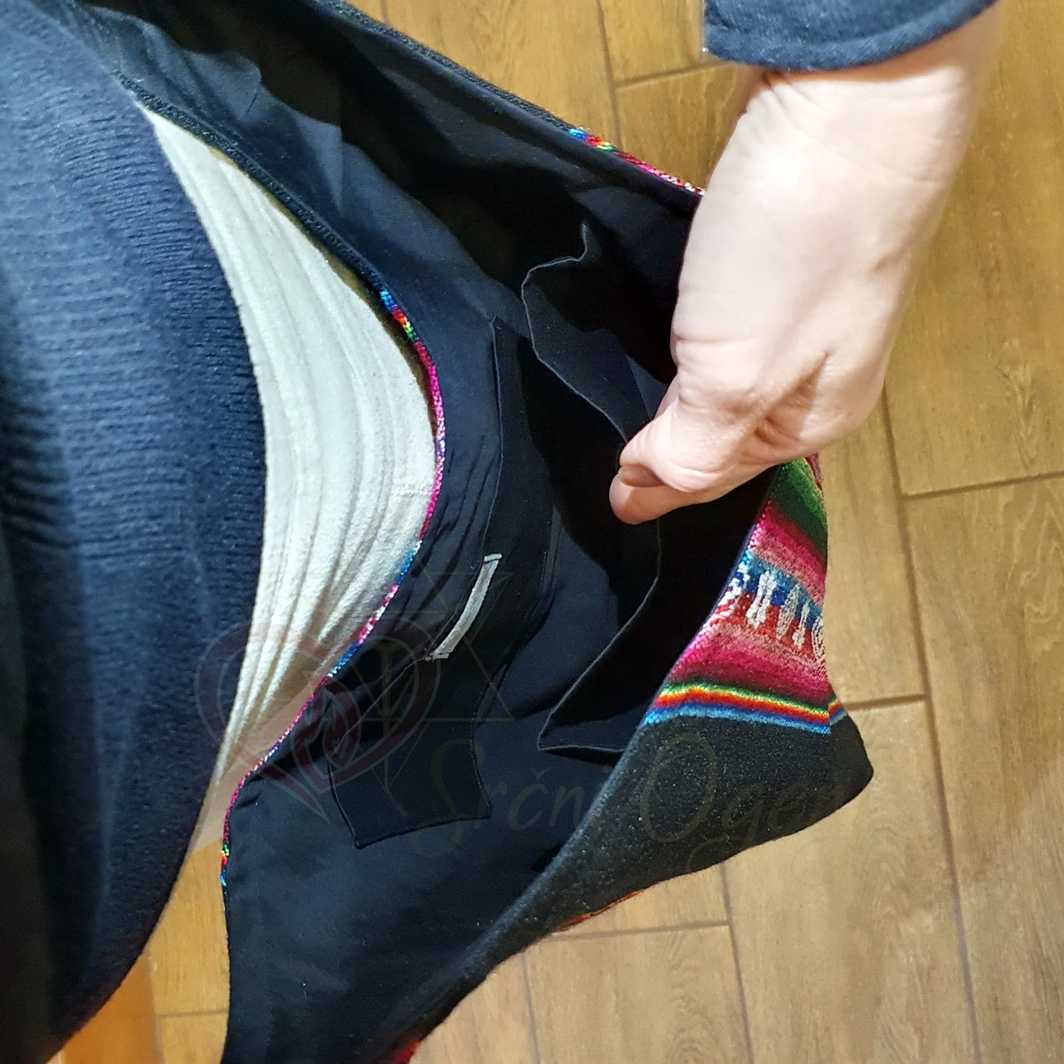 Bombažna tkanina, ki prihaja naravnost iz Andov, je tkana v tradicionalnih pisanih bolivijskih vzorcih izredno živih barv na črni podlagi. Notranjost je iz tanjšega bombažnega platna.